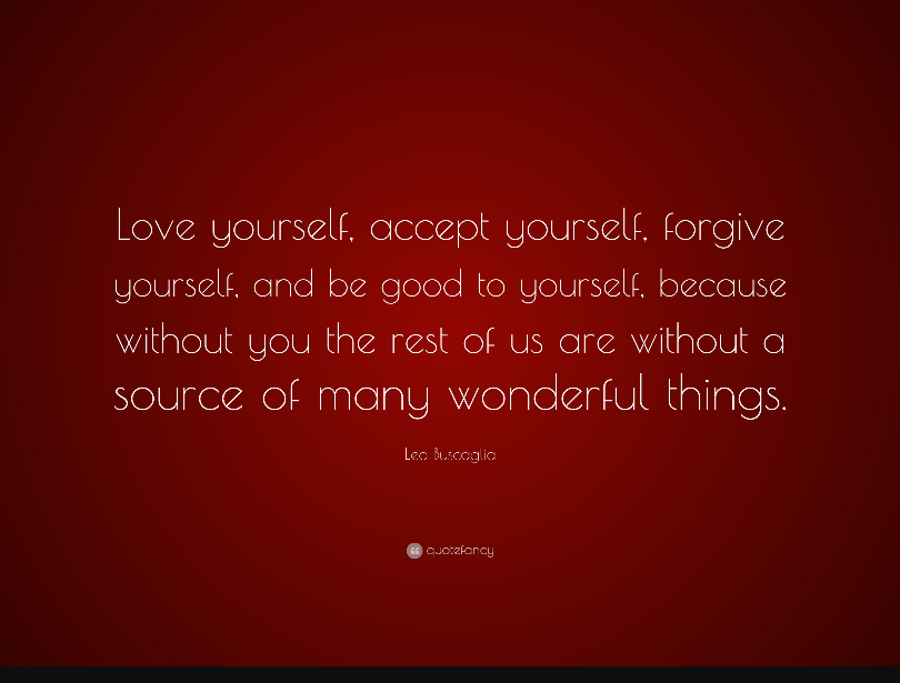 Posted in Love, Quotes Love Yourself Posted on August 2, 2016 by SparklyWarTanks Leo Buscaglia love yourself Quote Share this: Click to share on X (Opens in new window) X Click to share on Facebook (Opens in new window) Facebook Like Loading... Author: SparklyWarTanks View All Posts