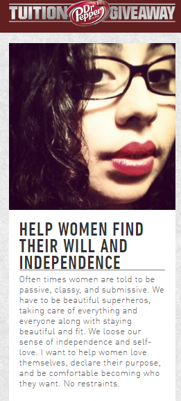 It took a day after when I was trying to accumulate votes to be able to upload a video, that I realized then that I wanted to expand SparklyWarTanks into an actual thing. Dr. Pepper helped me to see why I’m beautiful. It helped me to realized what I wanted to do with my life. How I want to impact the lives of others and why this is so important to me. I want to change how women see themselves and communicate their perspective and understanding to others through their culture, ideologies, and values.
