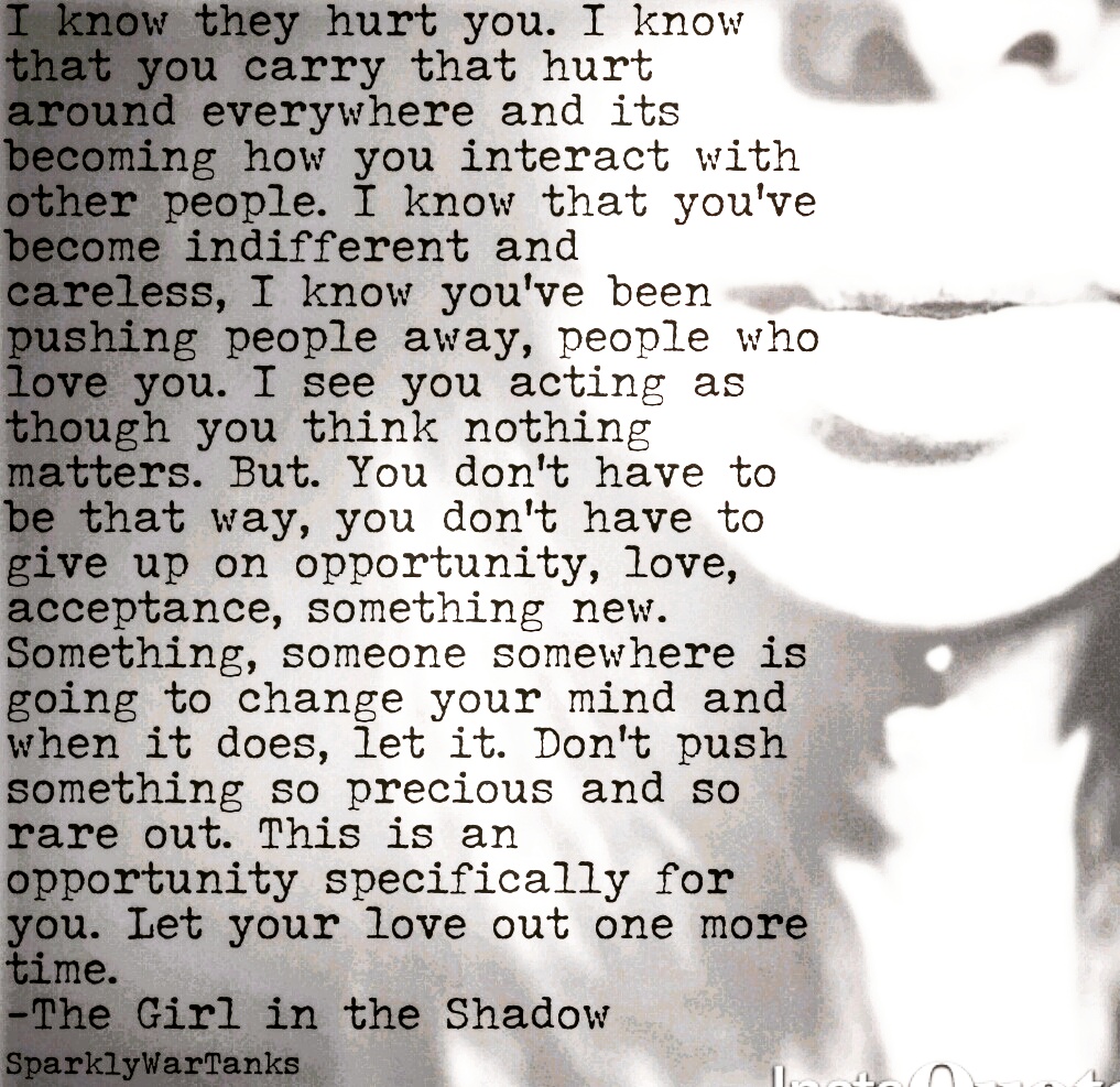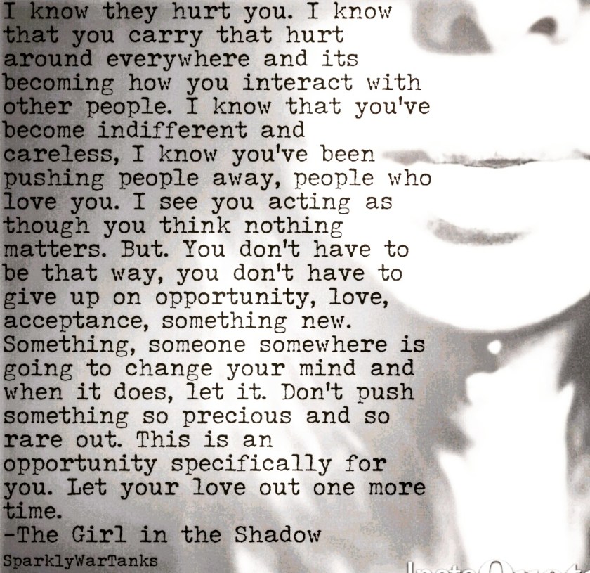 I see how hurt changed you and made you block happiness from coming in. I see how your mannerisms have shifted and how you act like nothing will ever be different. But you see, something good will happen and it will be just for you. Let it in when it does. Pain and hurt shouldn’t last forever. Letting it persist is a choice. Whatever it is, whatever has happened, whatever they did, let it go, don’t blame or push away good that’s coming to you. You have to be happy. You have to let the opportunity in, for your sake. You need to set yourself free from that misery. Let love in. Let it help you feel again.