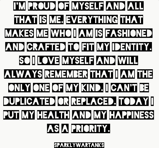 Posted in Keep Moving: Motivation and Inspiration, Potential and Worth, Power, Quotes, Self-Care, Self-Talk Freedom Quote: Proclamation Posted on April 23, 2017August 6, 2018 by SparklyWarTanks I am only one. I am important and I will put myself as a priority. This is a proclamation in case I forget to put my health and happiness first. Share this: Click to share on X (Opens in new window) X Click to share on Facebook (Opens in new window) Facebook Like Loading... Author: SparklyWarTanks View All Posts