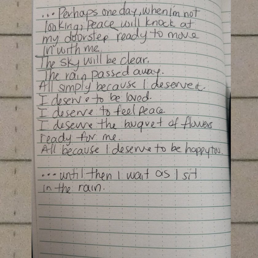 I feel it strike all the way to my chest. Not killing me though but maybe it should.…Perhaps one day, when I’m not looking, peace will knock at my doorstep ready to move in with me.