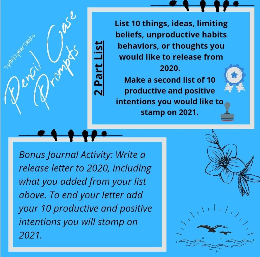 As a bonus journal activity: Write a release letter to 2020, including what you added from your list above. To end your letter add your 10 productive and positive intentions you will stamp on 2021.