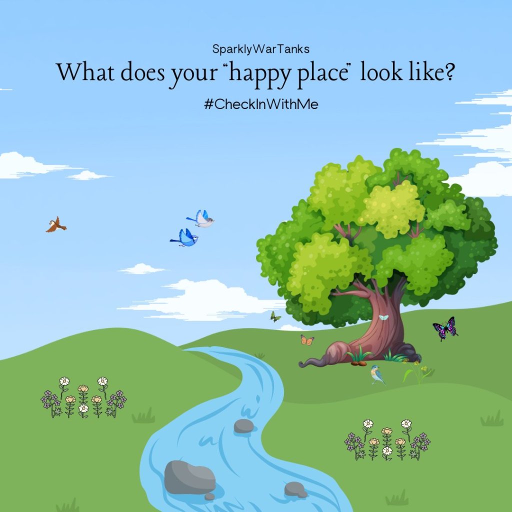My “calm and happy place” is walking through a nice green field with flowers on a sunny day. In the distance I can see a stream and a large tree where butterflies are slowly fluttering around.