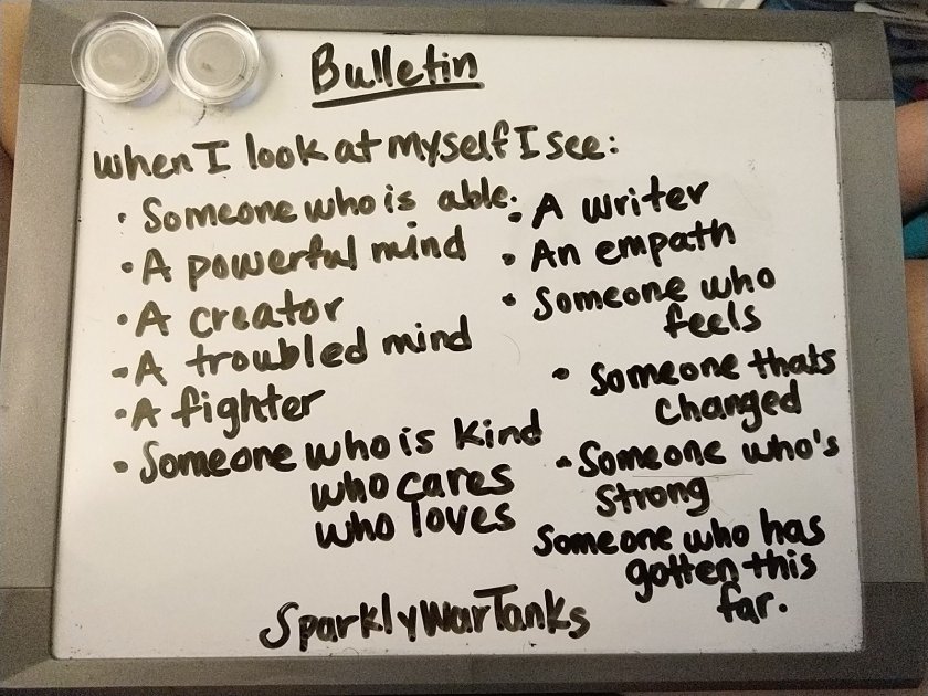 Approaching the fill-ins are your choice. What you feel you need to reflect and come to terms with, you can place in the blanks. Whether you want to reflect on your mental health, past, present, or goals will guide your responses.