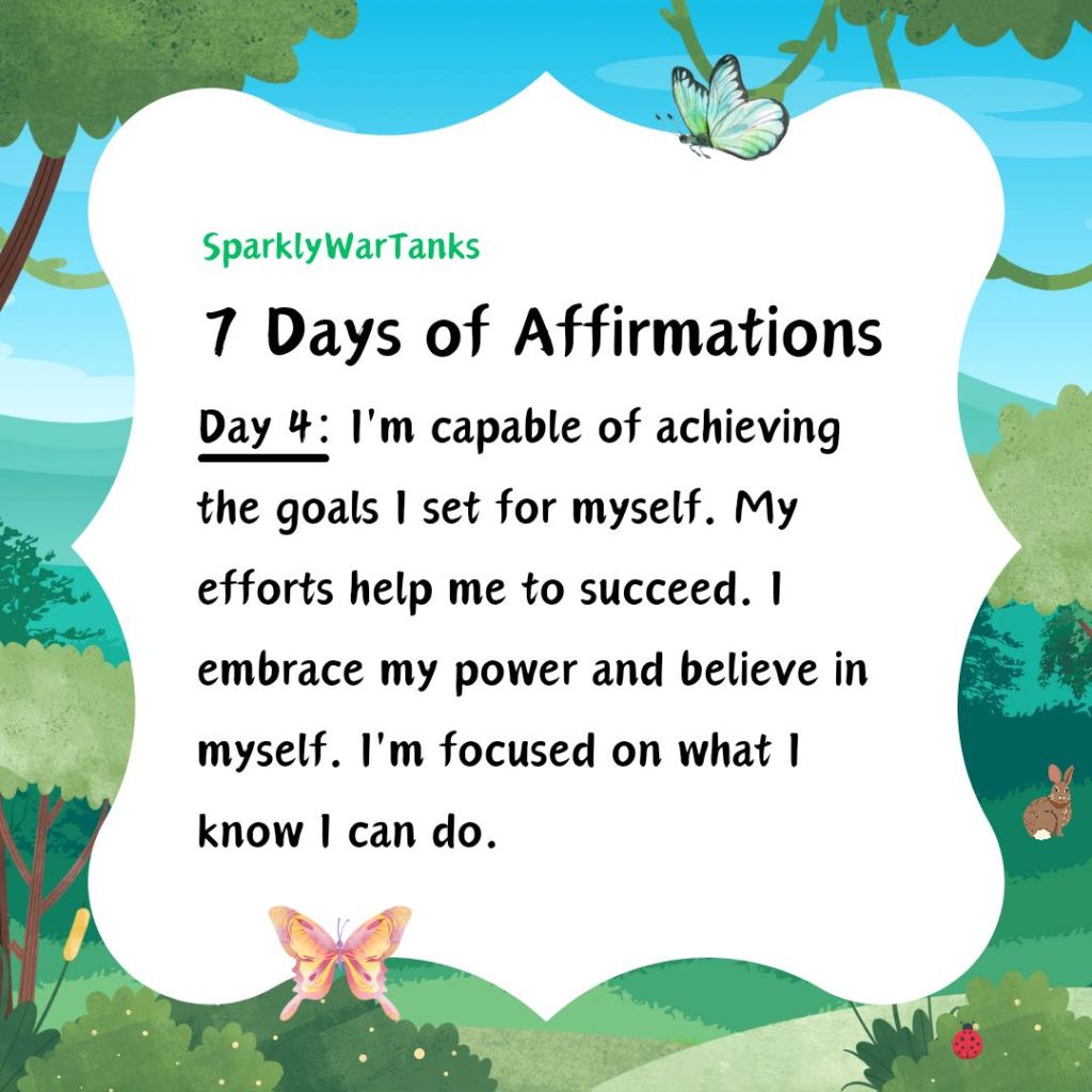 I’m capable of achieving the goals I set for myself. My efforts help me to succeed. I embrace my power and believe in myself. I’m focused on what I know I can do.