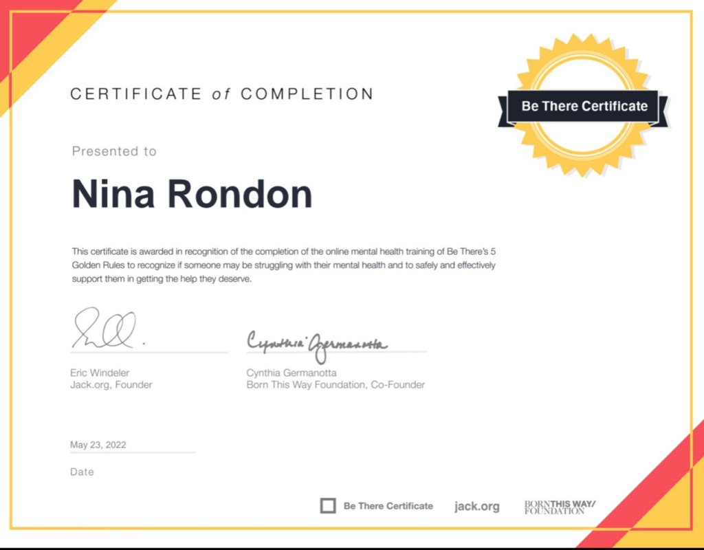 I wanted to share a free resource I was able to complete last month as a part of my Mighty responsabilities. It’s called the “Be There Certificate.” This certificate is great for helping to learn different ways you can support someone who may be struggling with their mental health, from language you can use to steps you can take to support the people who matter to you! It’s not always the easiest to navigate and approach difficult moments, but it’s definitely worth exploring in what ways you can help 🦋.