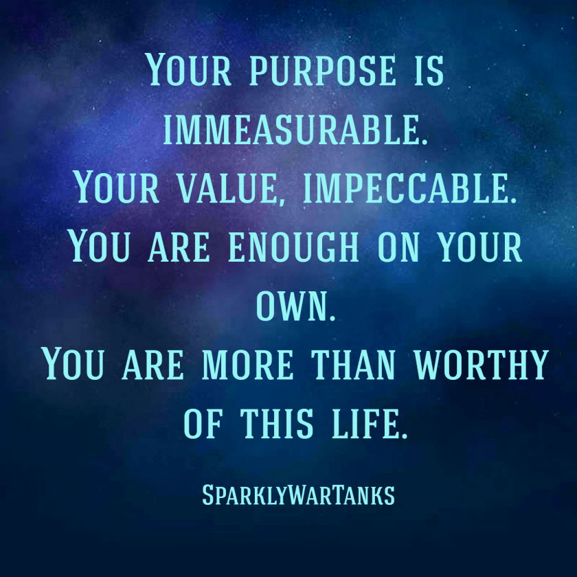 Here is a message I tell myself daily and would like you to know too: You are of value no matter what you are doing or what you’ve done. You wake up with purpose and will always have purpose. Adequacy, worth, value, peace, joy, calmness, balance, and wholeness is all that is you already. You just have to believe it to be true. Believe in your healing. Believe in your recovery. I love you guys.