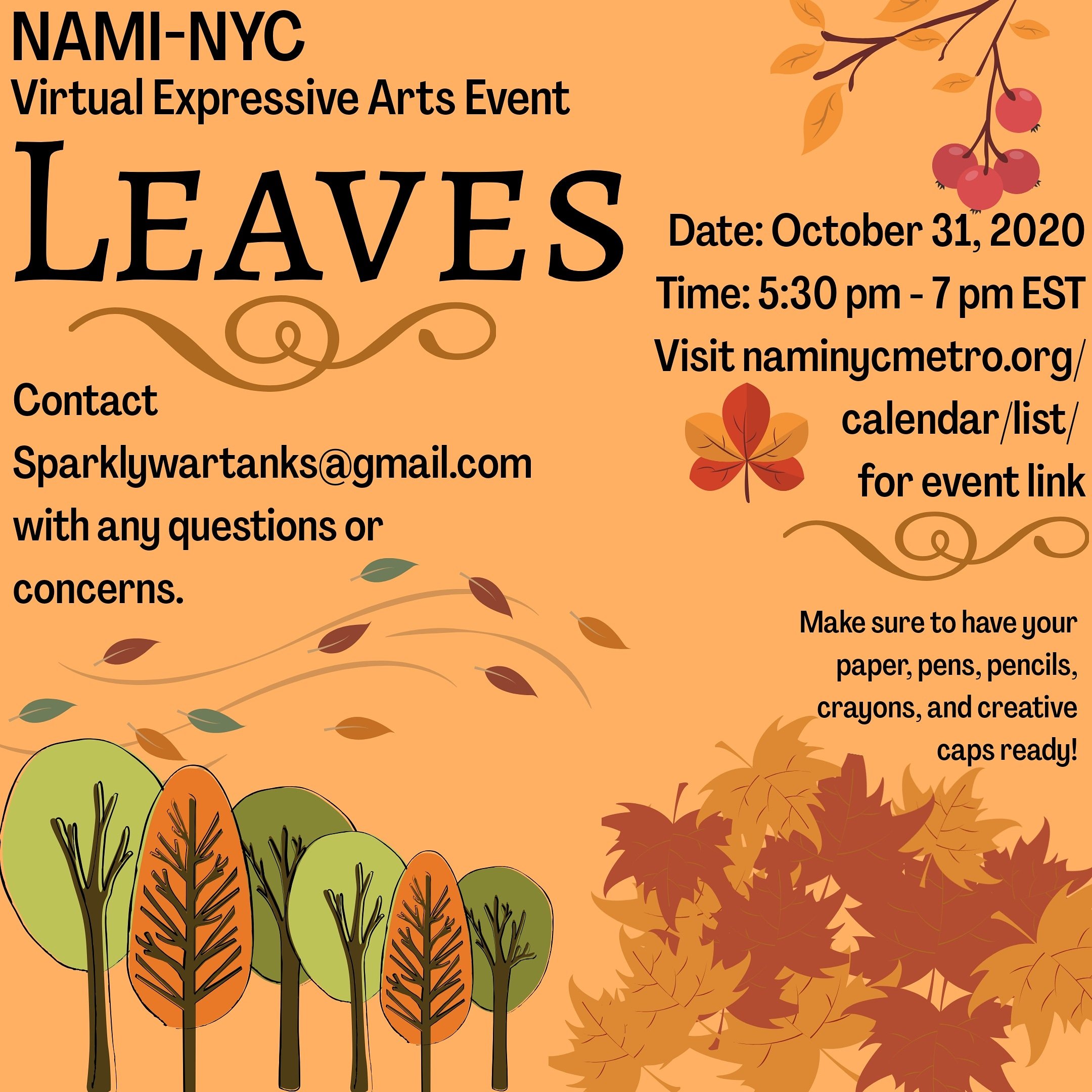 So very excited to announce the NAMI-NYC Expressive Arts workshop event I will be hosting at the end of the month! This event will be via Zoom and on the NAMI-NYC website. You can find the link by typing in the link in the flyer here and clicking the Expressive Arts Zoom link for May 29th, 2021. If you have any questions or concerns feel free to send me an email. The time of the event is in Eastern Standard Time.