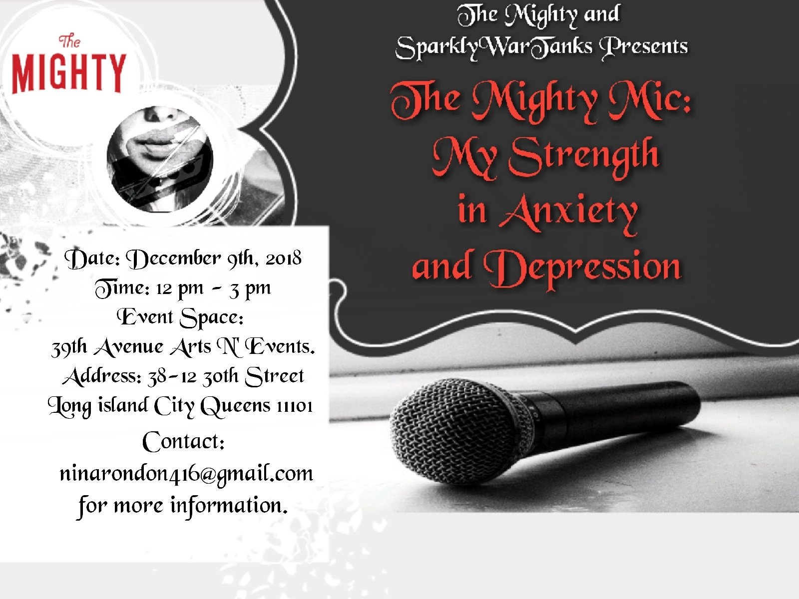 Im so excited to announce that I will be hosting The Mighty Mic, an open mic creative event where we all are mighty together. In this event, we will express ourselves in our strength as we discuss our anxiety and depression. The mic is open to those who want to share their stories, poems, songs, articles, speeches; whatever 5-minute piece they would want others to hear. This is a safe space where we will be ourselves, share, and build community!