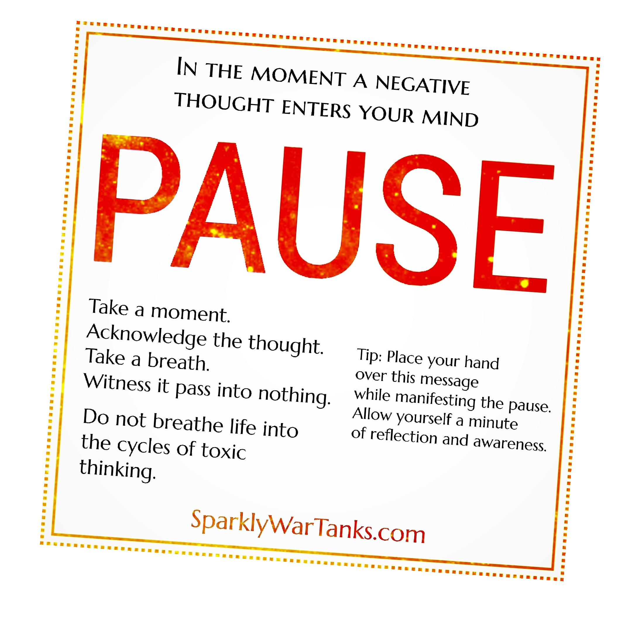 The idea is to learn how to “pause” at the moment a negative thought is introduced and build mindfulness around self-care and self-awareness. Whether it’s saying “pause” out loud or manifesting a pause in our actions, the act of pausing teaches us to manage our thoughts in hopes of creating a more workable outlook on our lives and experiences.
