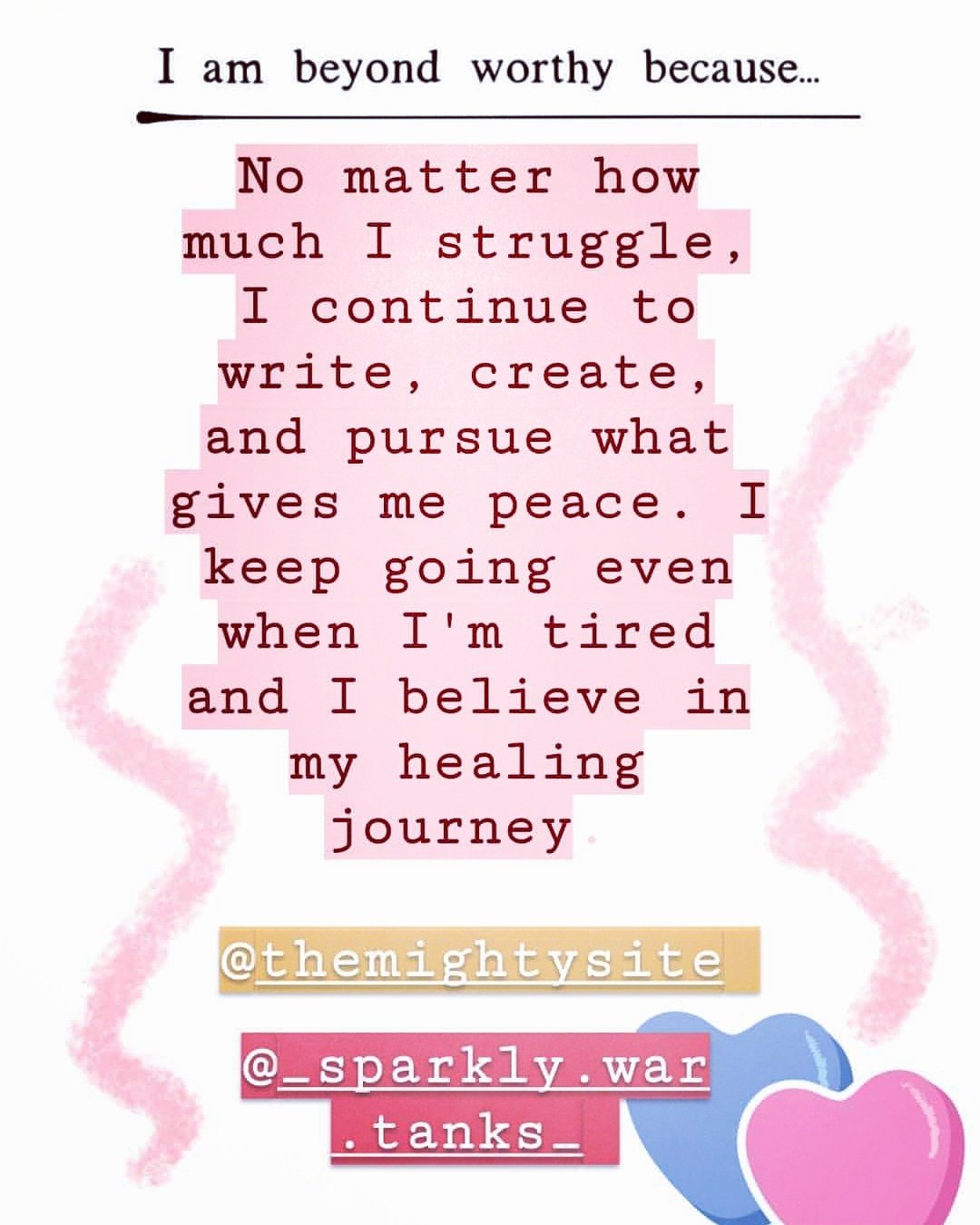 My projects now bring me to life, they are my medicine. The words I utter, the words I write are my power. I am new, I feel refreshed. I wage war on my mental health struggles, expectations, and stereotypes that bind me and my progress (hence why my writing space/blog is SparklyWarTanks).